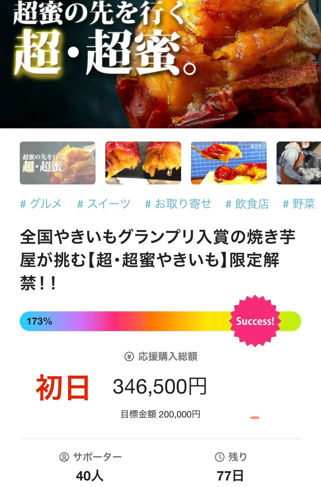 Makuakeで公開したプロジェクト 「超・超蜜やきいも」 が、開始からわずか3時間30分で目標金額を達成 いたしました。たくさんのご支援と温かいコメント、本当にありがとうございます。